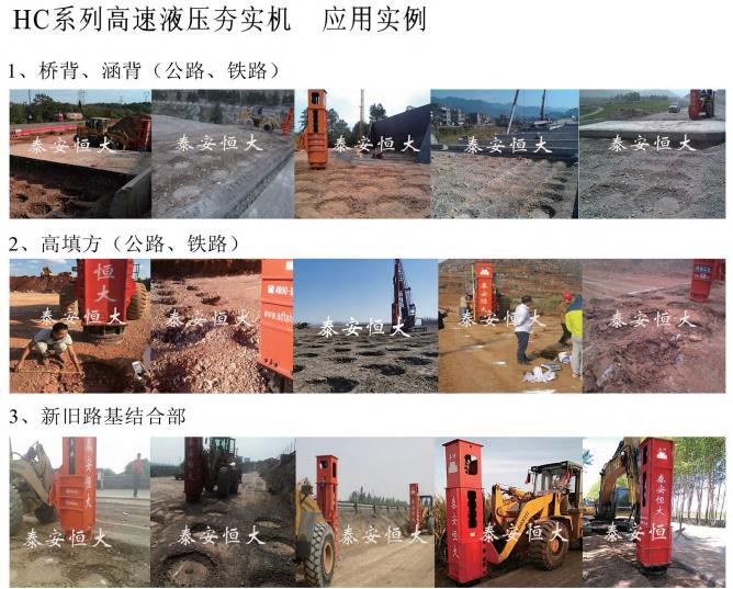 主要用于橋涵背、新舊路基結(jié)合部、高填方等公路、鐵路路基夯實(shí),堤壩及其護(hù)坡夯實(shí),建筑溝槽及回填土夯實(shí),環(huán)衛(wèi)垃圾、有害物質(zhì)填埋夯實(shí)等。用于高速公(鐵)路路基補(bǔ)強(qiáng)時,可使碾壓達(dá)標(biāo)路基繼續(xù)沉降10cm以上。